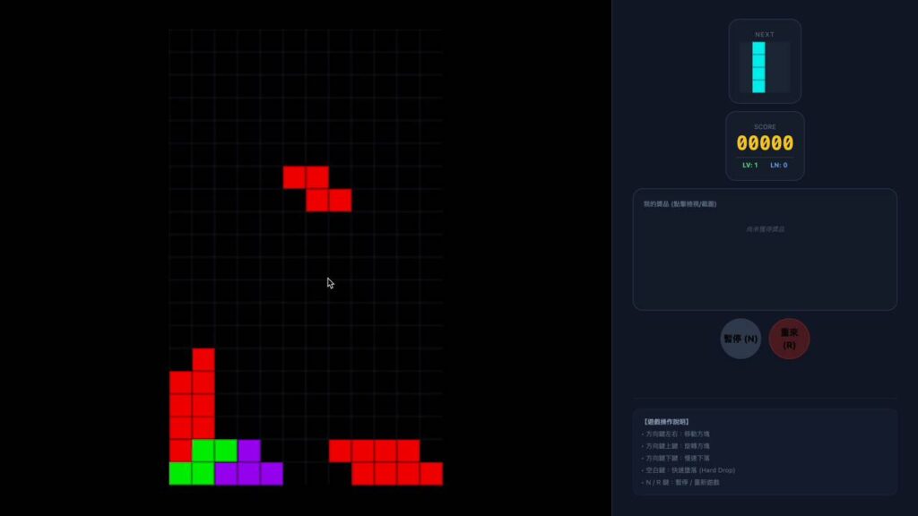 使用到網頁設計前端工程師與AI智能共同工作。我算是中間程度的前端工程師!感謝小天使,至少這件事不浪費我時間,一跟我講就中!昨天我也試了兩款遊戲,我知道問題出在哪,但今天跟我一講俄羅斯方塊馬上做出來。當然什麼形式服務大眾還沒決定,為了感謝小天使,錄製一個操作流程…感恩!比我以前講大道理有吸引力多了…