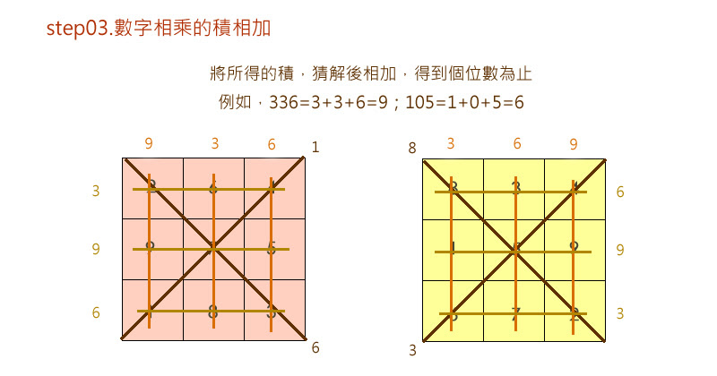 3.第三步驟,把相乘的積,拆解後,個別相加後得到數字