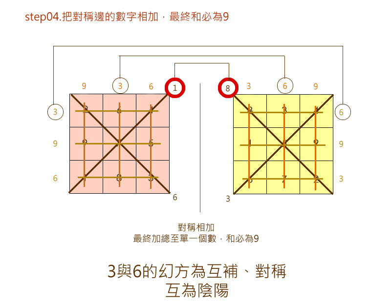 4.第四步驟,運用對稱概念,把對稱之數字相加,最終和為9(終極平衡數)